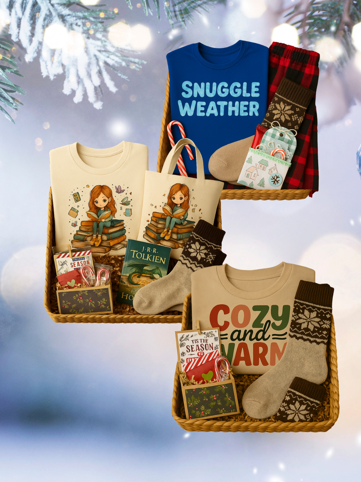 Each cozy basket is filled with soft tees, warm socks, and little treats—making it the perfect gift for Mom, Sis, your Bestie, or even yourself.